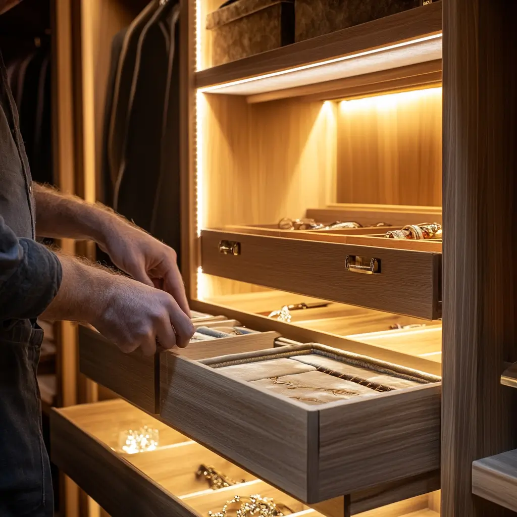 Enhance your closet with bespoke features such as adjustable shelving, built-in lighting, and specialized storage solutions tailored to your lifestyle.